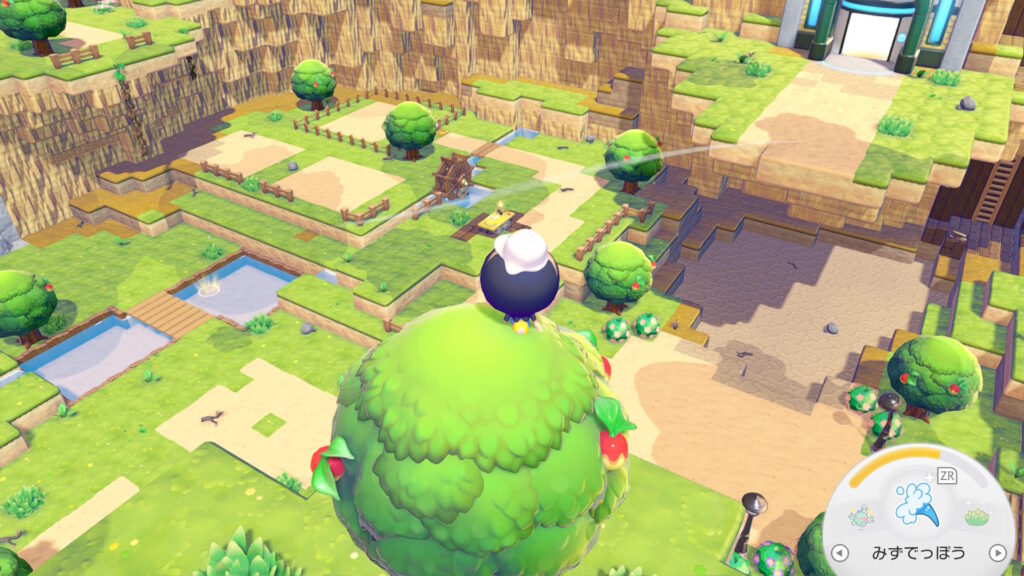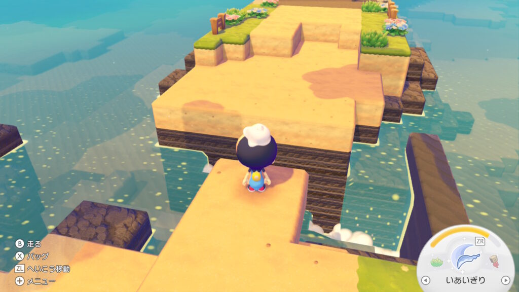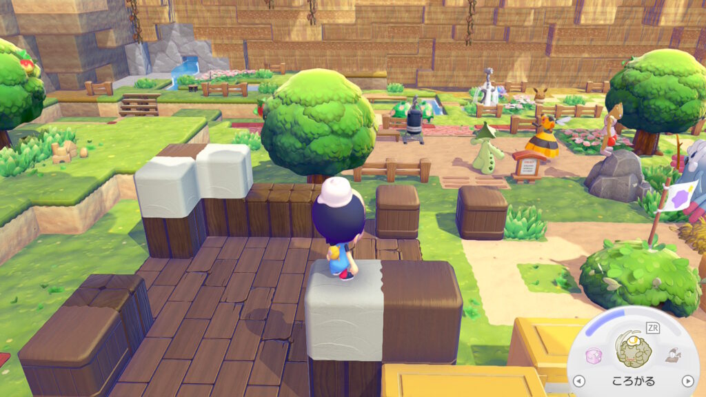 それにエリア全体を見回すと面白い場所もある。ポケセン南東に、廃墟が複数あり休憩できそうなスポットや花壇もある高台があるのだが、そこは普通に歩いてもアクセスできず、ブロックを積んだり空を飛ばないと行けない場所なのだが、どう見ても不自然に道が途切れている。