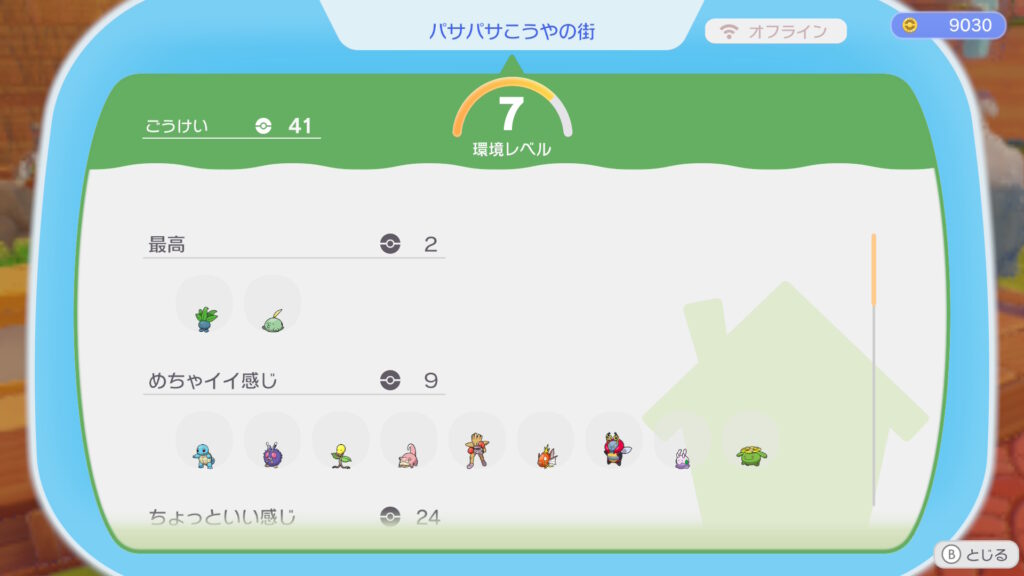 といっても街の景観が様変わりしたわけでもなく、手付かずの場所も多くある。そもそも、ある程度ポケモンが増えた後は住み心地を改善していけば環境レベルはどんどん上がっていく。プレイスタイルにもよるが、基本的に街の景観が完成する前に環境レベルが最大になるだろう。